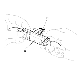 Um die Verriegelung zu lösen, an Federmanschette (A) und Gleitstück (B) ziehen; dabei die andere Hälfte des Steckers festhalten.