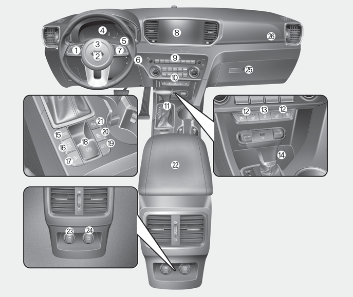 Kia Sportage: Ihr Fahrzeug im Überblick / Armaturenbrett im Überblick