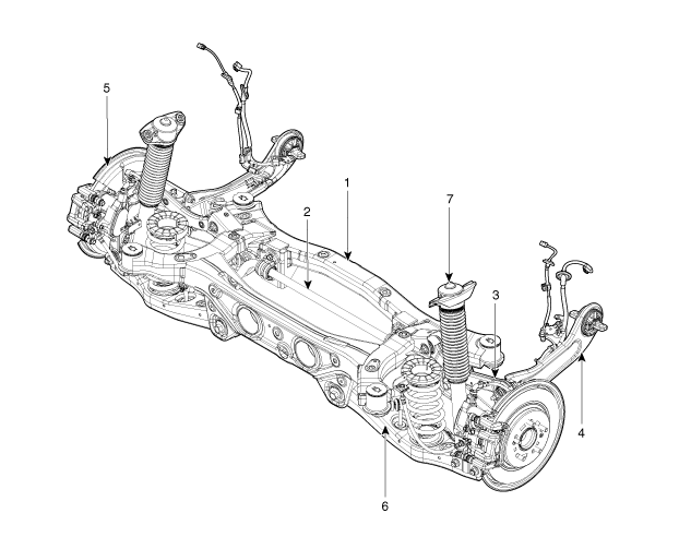 | 1. Hinterer Hilfsrahmen 2. Stabilisator hinten 3. Oberer Tragarm hinten 4. Längslenker |
