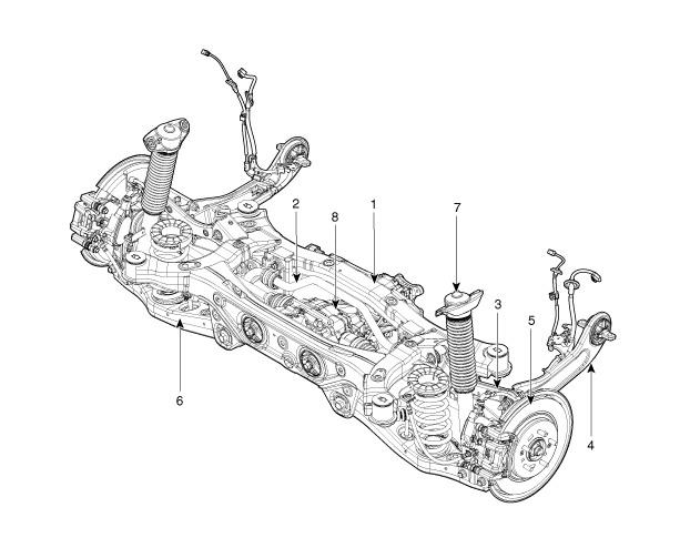 5. Hinterachse 6. Unterer Tragarm hinten 7. Hinterer Stoßdämpfer 8. Hinterer Differentialträger |