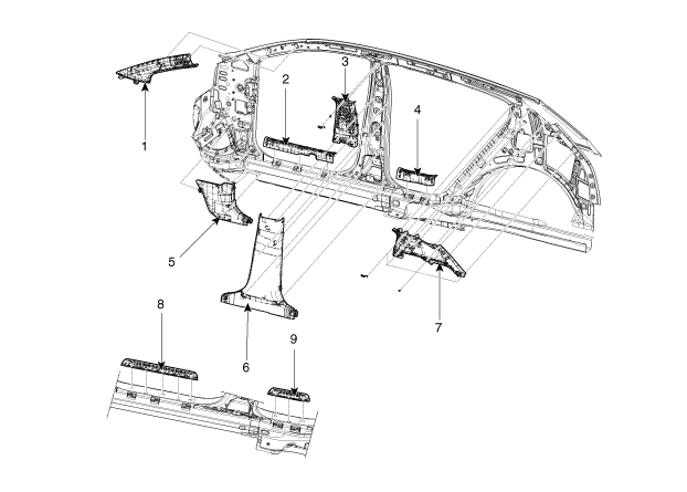 7. Heck Säulenverkleidung 8. Vordertür-Trittstufenverkleidung 9. Hintertür-Trittstufenverkleidung |
