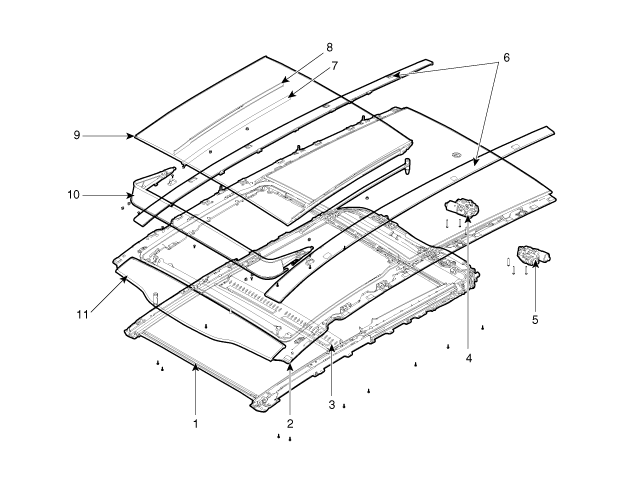 7. Panoramadachschieber 8. Faltbare Panoramadachabdeckung 9. Panoramadachscheibe 10. Panoramadach-Windabweiser 11. Vordere Panoramadachscheibe |