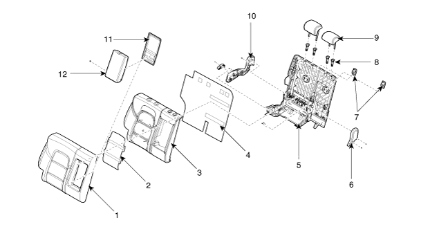 8. Rücksitzkopfstützenführung 9. Rücksitzkopfstütze 10. Äußerer Rücksitzlehnenbezug 11. Rücksitzarmlehne 12. Armlehne Rücksitz |