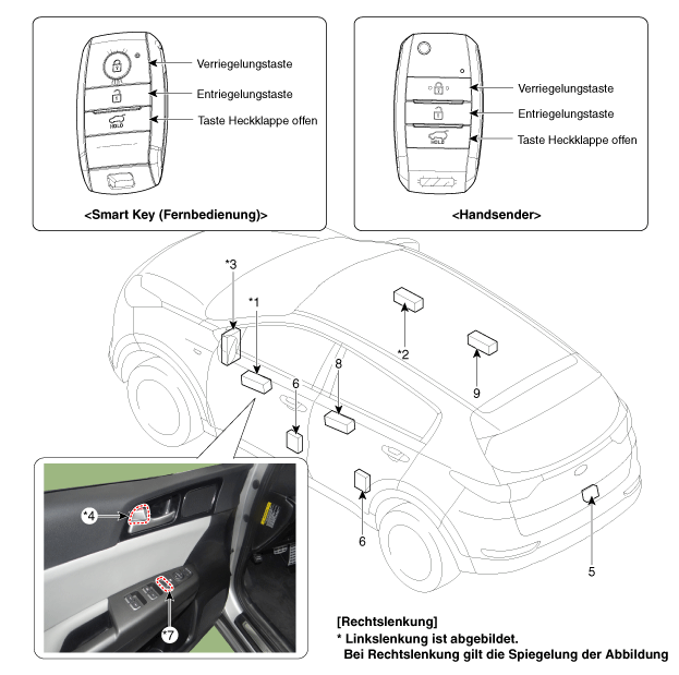 2. Fensterheberschalter (Beifahrerseite) 3. Smart Junction Block (SJB) 4. Türverriegelungsknopf 5. Heckklappen-Stellantrieb |