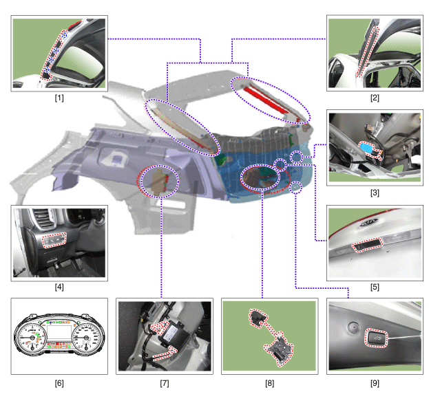 6. Kombiinstrument(USM) 7. Heckklappenmodul (PTGM) 8. Schloss der elektrischen Heckklappe und elektrisches Schließgerät 9. Innenschalter der elektrischen Heckklappe |