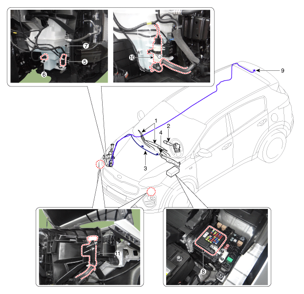 8. Scheibenwischer-/Waschanlagenrelais (integriert in Metallkernplatine) 9. Schlauch und Düse der Heckscheibenwaschanlage 10. Scheinwerfer-Waschanlagenmotor 11. Stellantrieb Scheinwerfer-Waschanlage |