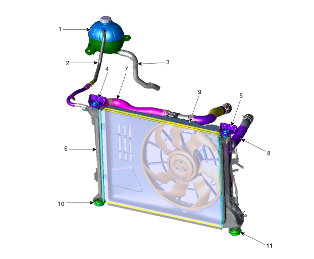| 1. Ausgleichsbehälter 2. Kühlerbehälterschlauch 3. Behälterschlauch 4. Obere Kühlerhalterung (rechts) 5. Obere Kühlerhalterung [links] 6. Kühler |