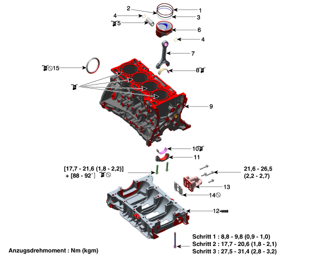 8. Oberes Pleuellager 9. Motorblock 10. Unteres Pleuellager 11. Pleuellagerdeckel 12. Leiterrahmen 13. Ölfilterhalterung 14. Ölfilterhalterungsdichtung 15. Hinterer Radial-Dichtring |