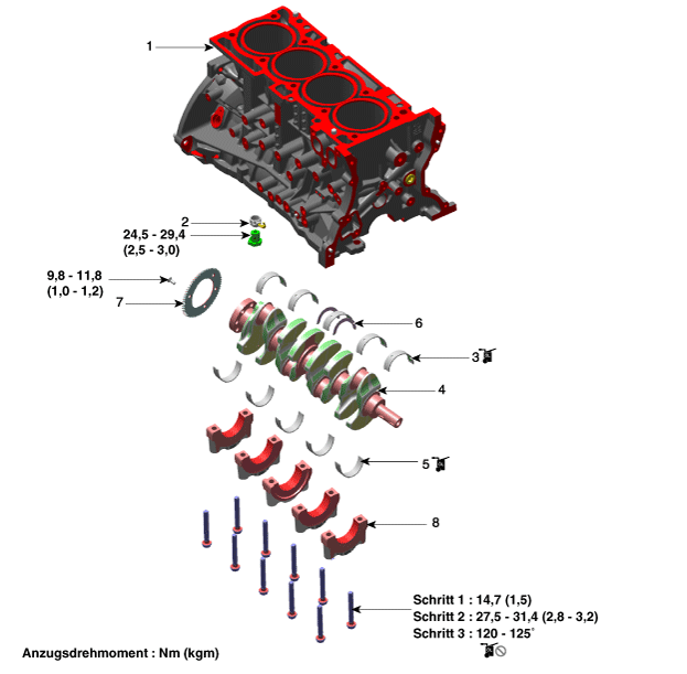 6. Drucklager 7. Kurbelwinkelsensor (CKPS)-Rad 8. Hauptlagerdeckel |