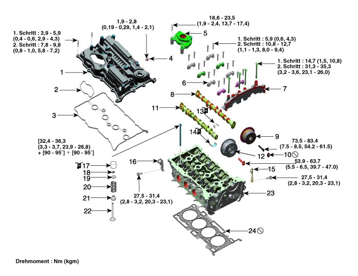 (MLA) 18. Ventilkeil 19. Halter 20. Ventilfeder 21. Ventilschaftdichtung 22. Ventil 23. Zylinderkopf 24. Zylinderkopfdichtung |