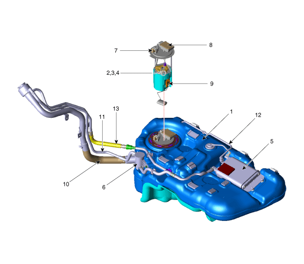 (FPCM) 9. Tankgeber (FLS) 10. Kraftstoffeinfüllschlauch 11. Entlüftungsschlauch 12. Dampfschlauch 13. Ausgleichsschlauch |