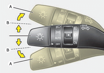 Betätigen Sie den Blinkerhebel zum Anzeigen eines Spurwechsels nur leicht, so dass er nicht einrastet, und halten Sie den Hebel fest (B). Nach dem Loslassen kehrt der Blinkerhebel in seine Ausgangsstellung zurück.