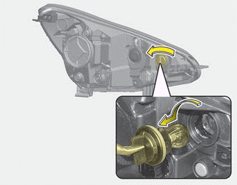 3. Entnehmen Sie die Glühlampe aus der Fassung, indem Sie die Glühlampe niederdrücken und gegen den Uhrzeigersinn drehen, bis ihre Rastnasen zu den Aussparungen in der Lampenfassung ausgerichtet sind. Ziehen Sie die Glühlampe aus der Fassung.