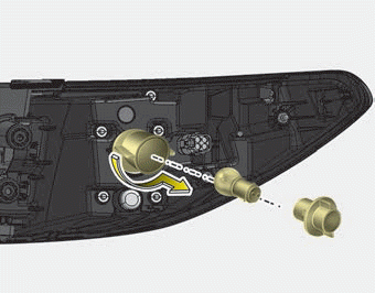 7. Entnehmen Sie die Glühlampe aus der Fassung, indem Sie die Glühlampe niederdrücken und gegen den Uhrzeigersinn drehen, bis ihre Rastnasen zu den Aussparungen in der Lampenfassung ausgerichtet sind. Ziehen Sie die Glühlampe aus der Fassung.