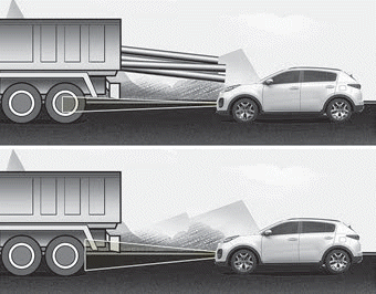 Wenn die Ladung des vorausfahrenden Fahrzeugs übersteht, oder das vorausfahrende Fahrzeug eine höhere Bodenfreiheit hat, ist besondere Aufmerksamkeit gefordert. Der FCAAssistent ist möglicherweise nicht in der Lage, die überstehende Ladung des Fahrzeugs zu erkennen. In diesen Fällen müssen Sie den vorgeschriebenen Sicherheitsabstand zum hinteren Ende der Ladung einhalten und gegebenenfalls das Bremspedal treten, um die Fahrgeschwindigkeit und den Sicherheitsabstand anzupassen.
