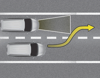 In diesem Fall warnt das System möglicherweise den Fahrer und betätigt die Bremsen, obwohl dies nicht nötig ist. Achten Sie beim Fahren stets auf den Straßenzustand und die Fahrumstände. Treten Sie gegebenenfalls das Bremspedal, um die Fahrgeschwindigkeit zu drosseln und den Sicherheitsabstand anzupassen.