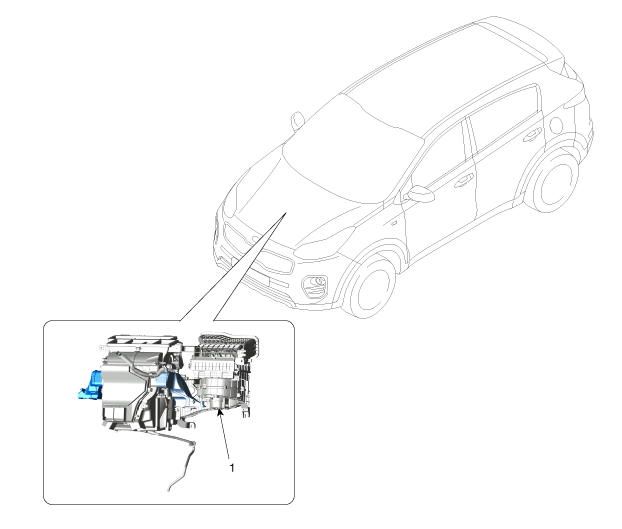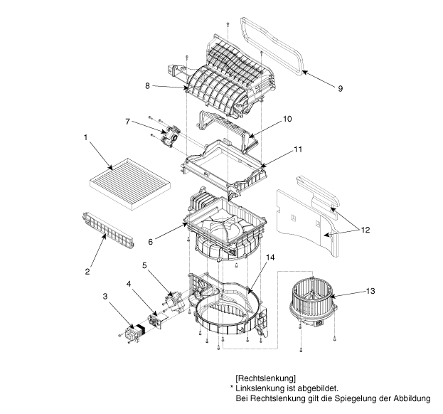 | 1. Luftfilter 2. Luftfilterabdeckung 3. FET-Einheit 4. Gebläsewiderstand 5. Kombiinstrument-Ionisierer 6. Gebläsegehäuse [oben] 7. Frischluft/Umluft-Stellantrieb |