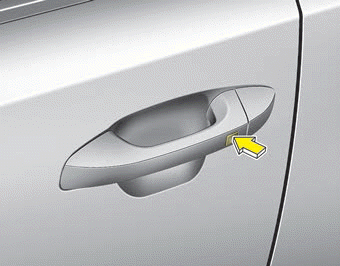 Wenn Sie den Knopf in einem vorderen Außentürgriff drücken, während alle Türen (und Heckklappe) geschlossen sind und eine oder mehrere Türen entriegelt sind, werden alle Türen (und Heckklappe) verriegelt. Die Warnblinker leuchten einmal kurz auf, um anzuzeigen, dass alle Türen (und der Kofferraum) verriegelt wurden. Die Türen können durch diesen Knopfdruck nur verriegelt werden, wenn sich der Smart- Key in einer Entfernung von bis zu 0,7 ~ 1 m zum Außentürgriff befindet. Wenn Sie sich vergewissern möchten, ob eine Tür verriegelt wurde oder nicht, prüfen Sie die Türverriegelungstaste im Inneren des Fahrzeugs oder ziehen Sie an dem Außentürgriff.