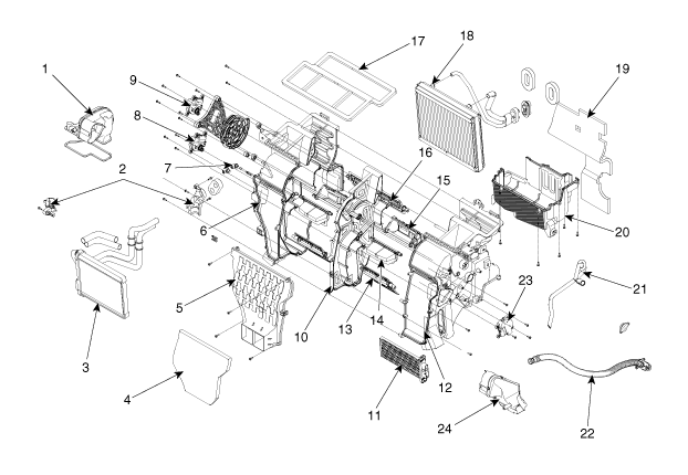 14. Fußraumklappe 15. Belüftungsklappe 16. Beschlagentfernungsklappe 17. Lüftungsdichtung 18. Verdampferkern-Einheit 19. Geräuschdämmung 20. Heizungskasten [Unten] 21. Ablassschlauch 22. Ansaugschlauch 23. Temperatur-Stellantrieb [rechts] 24. Fußraum-Belüftungsschacht [Recht] |