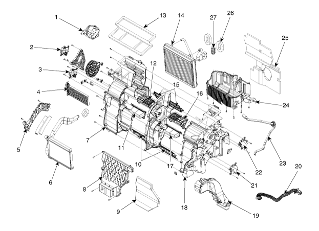 16. Belüftungsklappe [RH] 17. Bodenklappeneinheit [RH] 18. Heizungskasten [RH] 19. Spritzwasserkanal [RH] 20. Ansaugschlauch 21. Temperatur-Stellantrieb [RH] 22. Auto-Beschlagentfernungsstellantrieb 23. Ablaufschlauch 24. Heizungskasten [Unten] 25. Geräuschdämmung 26. Flanschdichtung 27. Flanschgummi |