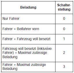 In der folgenden Tabelle sind Beispiele für ordnungsgemäße Schalterstellungen aufgeführt. Für Beladungszustände, die hier nicht aufgeführt sind, drehen Sie das Stellrad in eine Stellung, die einem aufgeführten Beispiel am nächsten kommt.