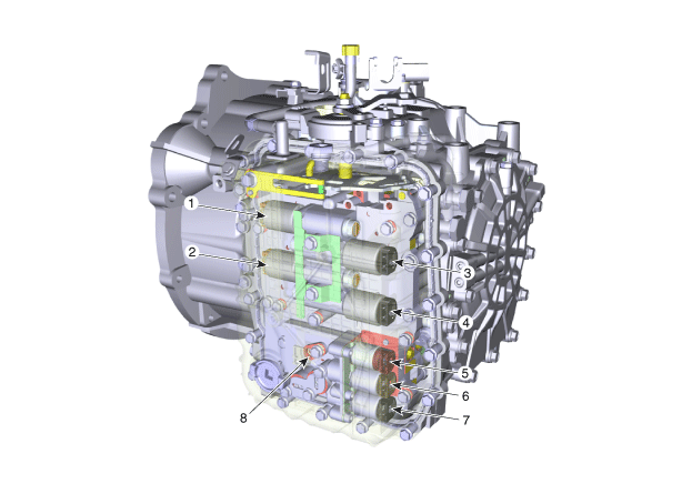 6. Drehmomentwandler-Steuermagnetventil (T/CON) 7. Leitungsdruckregelmagnetventil 8. Öltemperatursensor |