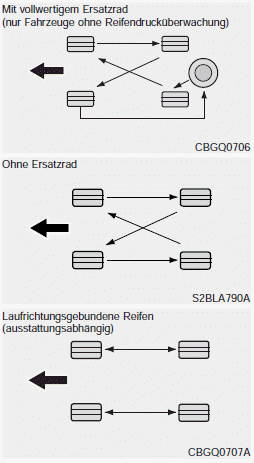 Tauschen Sie laufrichtungsgebundene Reifen nur zwischen Vorder- und Hinterachse einer Fahrzeugseite, aber nicht zwischen der rechten und linken Fahrzeugseite.