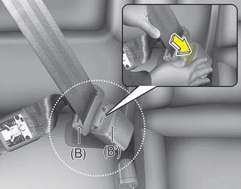 1. Drücken Sie die Entriegelungstaste am Gurtschloss (B’) und ziehen Sie die Schließzunge (B) heraus.
