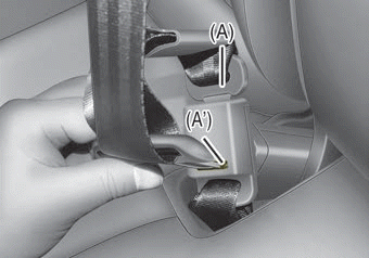 2. Zum Aufrollen des mittleren Sicherheitsgurts der Rücksitzbank führen Sie die Schließzunge in die Gurtband-Abrollöffnung (A') ein. Ziehen Sie das Gurtband nach oben und lassen Sie es automatisch aufrollen.