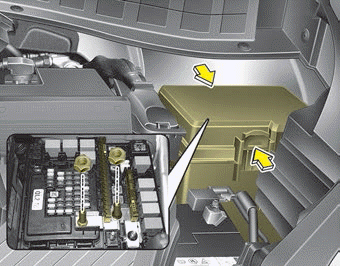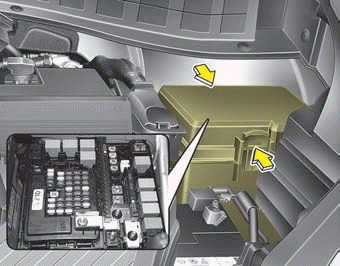 Verschließen Sie nach Arbeiten am Sicherungskasten im Motorraum fest den Deckel des Sicherungskastens. Wenn der Deckel nicht hörbar einrastet, kann Feuchtigkeit eindringen und elektrische Fehlfunktionen verursachen.