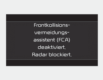 Das System wird ordnungsgemäß funktionieren, nachdem Schmutz/Schnee oder Fremdpartikel entfernt wurden. Trotzdem funktioniert der FCA-Assistent möglicherweise nicht ordnungsgemäß in Gegenden (zum Beispiel auf freier Fläche), wo nach dem Anlassen des Motors nicht alles erkannt wird. Auch wenn keine Warnmeldung auf dem LCD-Display erscheint, funktioniert der FCA-Assistent möglicherweise nicht ordnungsgemäß.